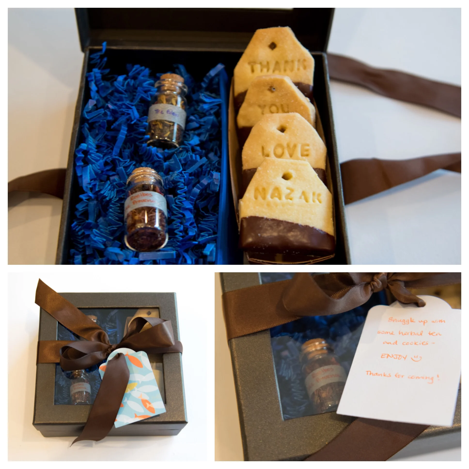 Why do only kids at birthday parties get goodie bags? I'm an adult, and I want a goodie bag, and I'm not ashamed to admit it ;). Along with the monogrammed pashminas, and felt turtle boats, I felt like we needed one more thing. One more sweet thing. Nazak is a huge fan of teas and sweet snacks that go with them. So I filled two small vials of her favorite teas (from David's Tea) and made tea bag shaped shortbread cookies that had a personalized thank you message on them :).