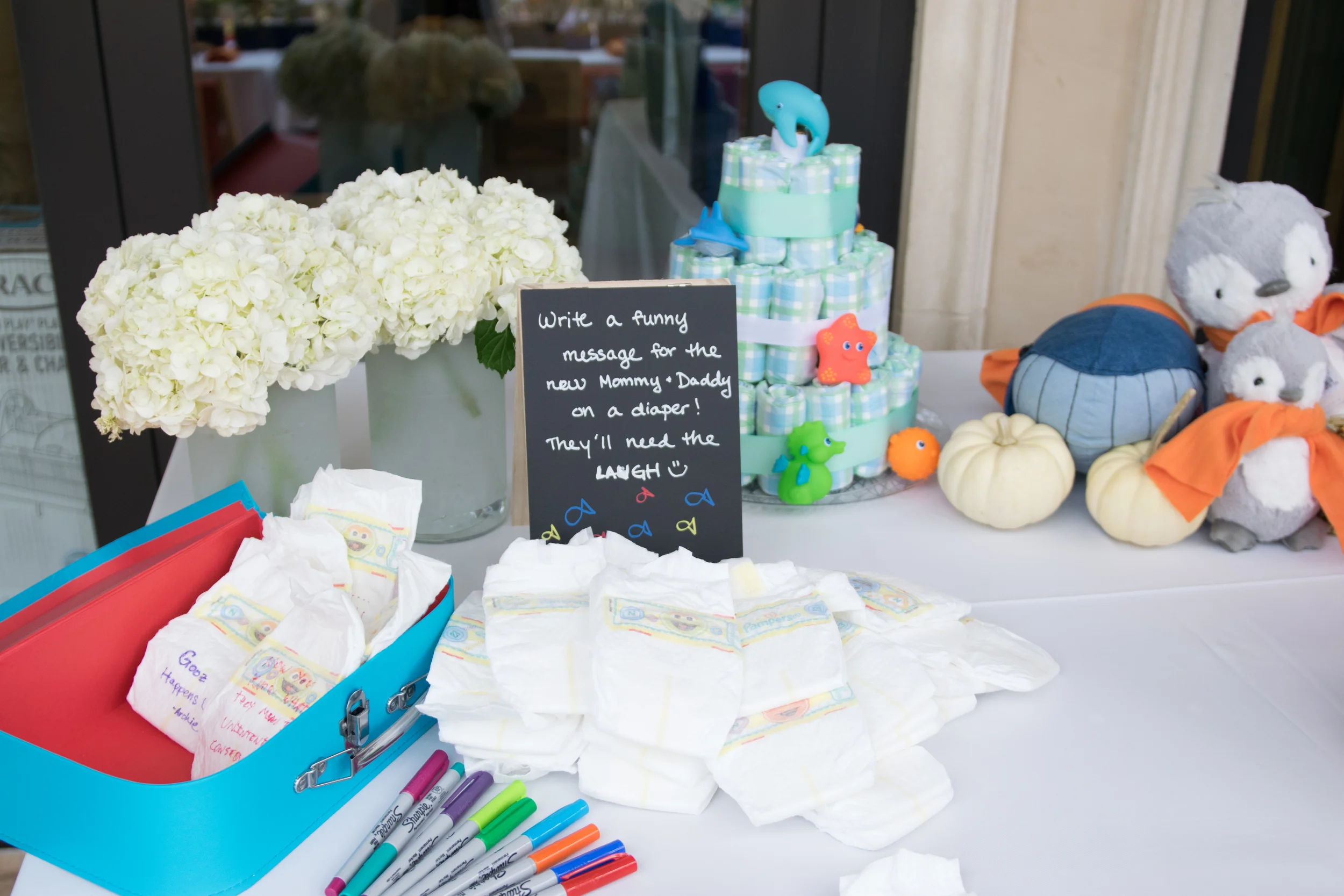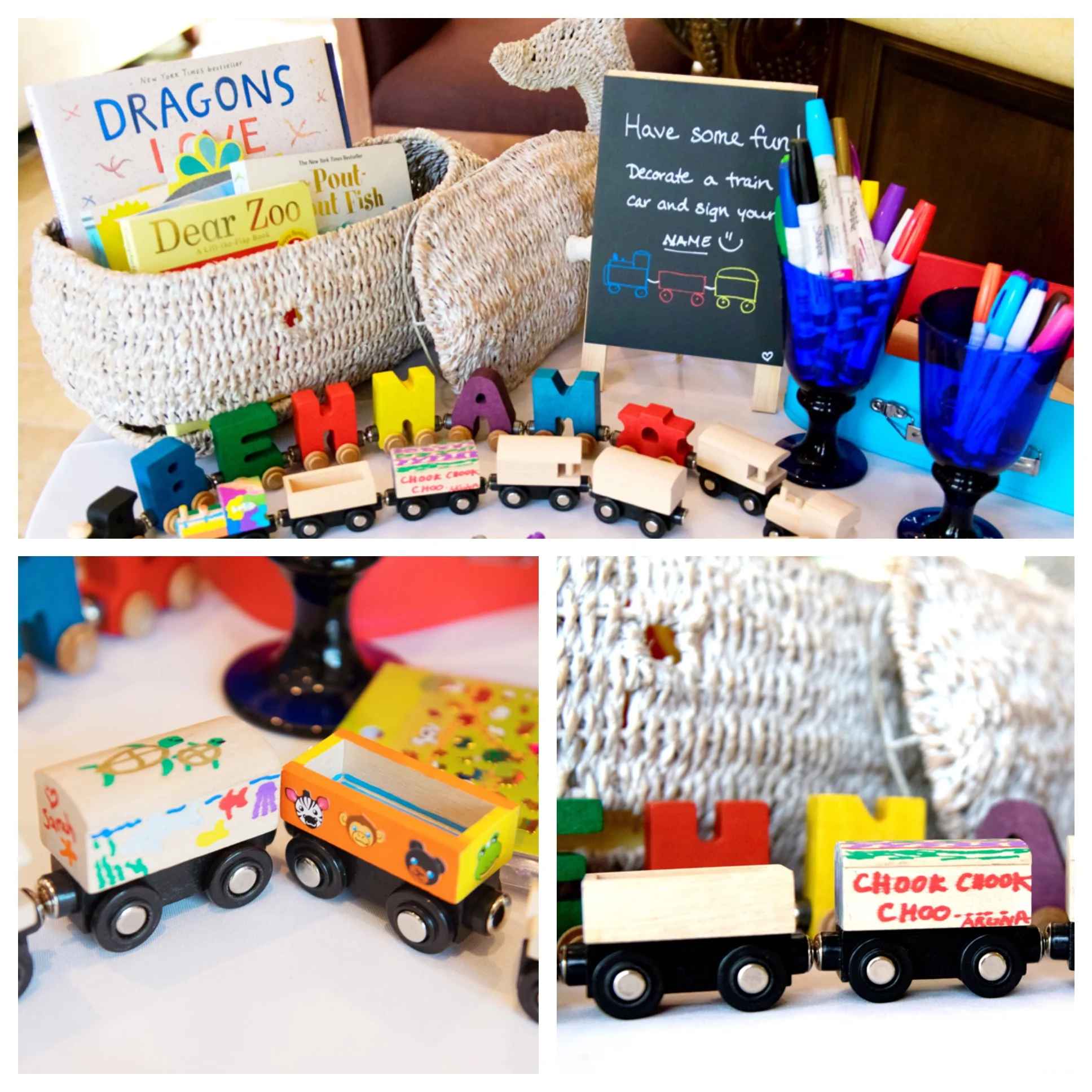 Instead of bringing a greeting card, I suggested that the guests bring a children's story book and sign a small note for baby on the inside. That way you will forever have a memory of the special day and a great story to read to baby. And yes, that is a whale wicker basket -- I fell in love with him! We had some small activities for guests to do as well; like decorating a train car for baby, and writing a funny message on a diaper for Mom and Dad to be.